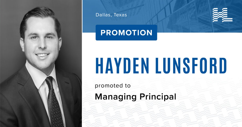 Holt Lunsford Commercial (HLC) is pleased to announce the promotion of Hayden Lunsford to the position of Managing Principal. In this new role, Lunsford will be responsible for overseeing all development and construction activities, sourcing new opportunities, financing, and equity relationships for the company’s multifamily product line.